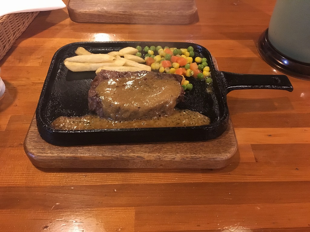 カナディアンロッキー ロッキーステーキ(ガーリックみそ、ライス、ごま、アイス・バニラ)。